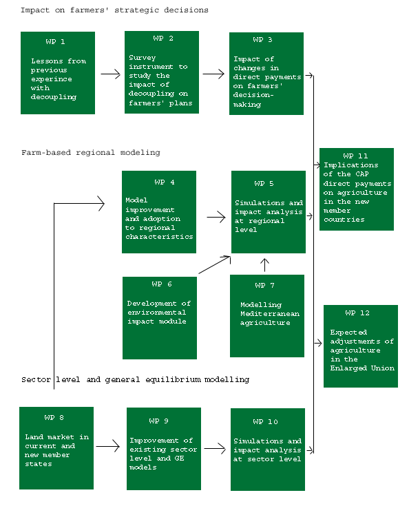 Compared with the previous CAP reforms, the introduction of a single payment per farm implies a fundamental change in policy institutions. Due to the scale and the nature of the change it is extremely difficult to foresee the impact that the reform may have on the relevant aspects of European agriculture. In particular, no single methodological approach is able to accomplish such a task. Therefore, the project is organised around three complementary and inter-related approaches. These approaches include (a) survey-based analysis of the strategic behaviour of farmers, (b) dynamic farm level/regional modelling and, (c), sector/general equilibrium modelling. The work is organised into 12 workpackages. A broad summary of the workpackages and the relations between them is presented below. Figure 1 illustrates the workpackage structure.